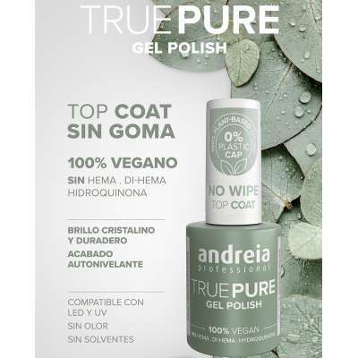 El Top Coat No Wipe Vegano de Andreia Gel Polish True Pure está especialmente diseñado para quienes buscan una manicura profesional, duradera y segura, incluso en uñas y pieles sensibles. Su fórmula innovadora, libre de HEMA, Di-HEMA e hidroquinona, combina protección y alto rendimiento, ofreciendo un acabado brillante, uniforme y autonivelante sin necesidad de limpieza tras la catalización.