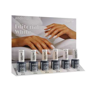 Descubre la pureza y sofisticación del blanco con el expositor Editorial White de Andreia The Gel Polish, una colección de edición limitada inspirada en la tendencia de belleza minimalista y el tono Pantone Cloud Dancer. Este expositor incluye 6 tonos únicos que exploran diferentes acabados del blanco, desde texturas lechosas hasta reflejos metálicos y translúcidos, ofreciendo versatilidad y creatividad en cada manicura.