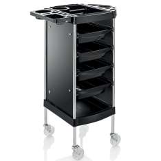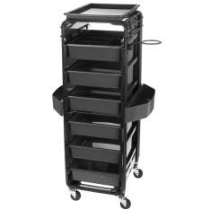 Carrito auxiliar de peluquería con todas las características necesarias para el orden y la comodidad. Dotado de 6 bandejas extraíbles para almacenar material de trabajo y otra bandeja superior fija con varios compartimentos de diferentes formas y tamaños, que te permitirán tener todo lo necesario organizado y cerca de tí. Dispone de 4 ruedas para poder moverlo por el salón de forma rápida y cómoda; lo que te permiten tenerlo a tu lado en todo momento. Uno de sus compartimentos superiores es perfecto para poner el bowl mientras estás en un servicio de coloración.