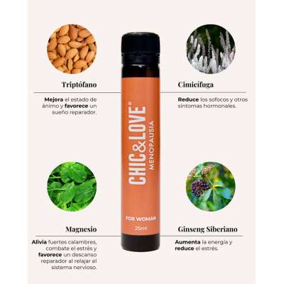 Su formato en viales bebibles de rápida absorción permite una acción inmediata y práctica, adaptándose perfectamente a tu rutina diaria. Con extractos de plantas, vitaminas y minerales cuidadosamente seleccionados, ayuda a reducir los sofocos, mejora la calidad del sueño, combate la fatiga y promueve un estado de ánimo positivo.