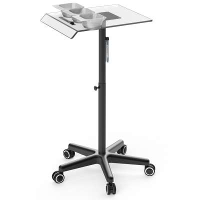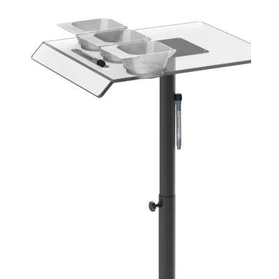 Utilizar como carro auxiliar de trabajo para servicios de coloración. Aprovechar la superficie acrílica para escribir mezclas o notas con los rotuladores incluidos. Regular la altura según la necesidad del tratamiento y organizar utensilios en los cuencos disponibles.