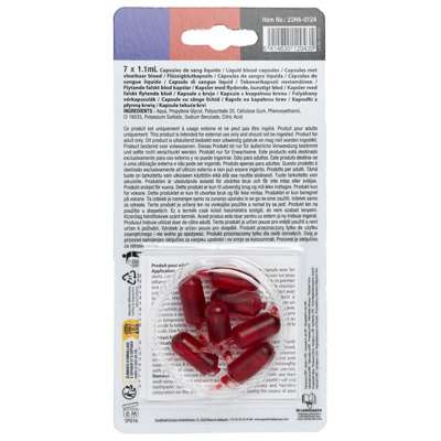 Cada cápsula contiene falsa sangre líquida, que al romperse en la boca genera un impactante efecto de hemorragia o mordida, logrando un resultado auténtico y profesional. Su presentación en blíster de 7 unidades las hace perfectas para varios usos o sesiones de maquillaje. Es un producto de uso adulto, seguro y fácil de aplicar.